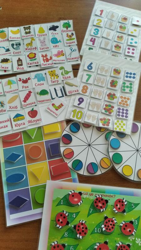 Набір ігор на липучках для вивчення кольорів, рахунку, цифр та літер. У набір входять: - Гра український алфавіт, 33 деталі - Гра рахунок та цифри, 40 деталей - Гра Дошки Сегена, 12 деталей на липучках - Гра кольори, 2 рівня, 20 деталей - Гра рахунок Сонечко-листочок, 10 деталей на липучках Вартість набору: 500 грн