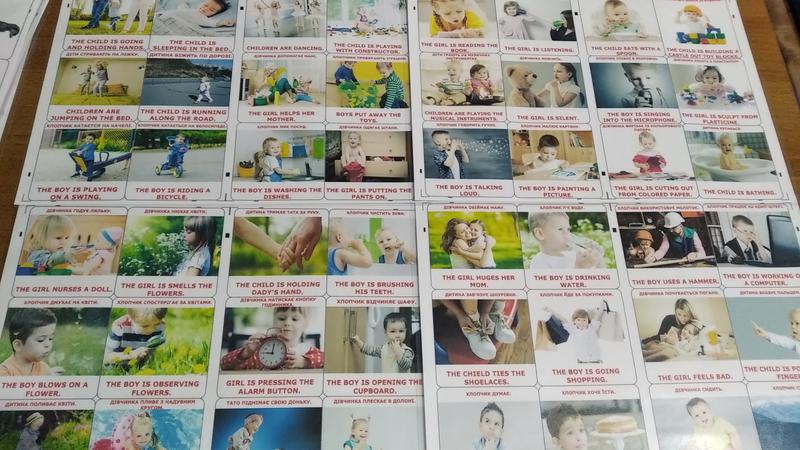 Плакат складається з 4 ламінованих частин у форматі А4. Кожна ламінована частина містить 12 елементів. Мова підписів зображень: українська-англійська. Плакати можна прикріпити на будь-яку поверхню використовуючи двосторонній скотч (не йде в комплекті) або займатись безпосередньо без прикріплення плаката.