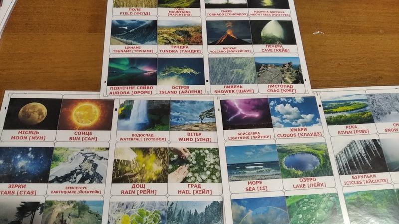 Плакат складається з 3 ламінованих частин у форматі А4. Кожна ламінована частина містить 12 елементів. Мова підписів зображень: українська-англійська. Плакати можна прикріпити на будь-яку поверхню використовуючи двосторонній скотч (не йде в комплекті) або займатись безпосередньо без прикріплення плаката.