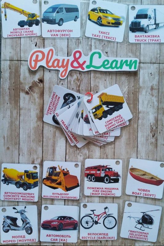 Двосторонні картки на кільці. Картки мають захисні поля ламінації. 24 елементи/12 карток. Кожна картка містить зображення, підпис українською та англійською мовами, транскрипцію українською мовою. Кільце за потреби знімається.