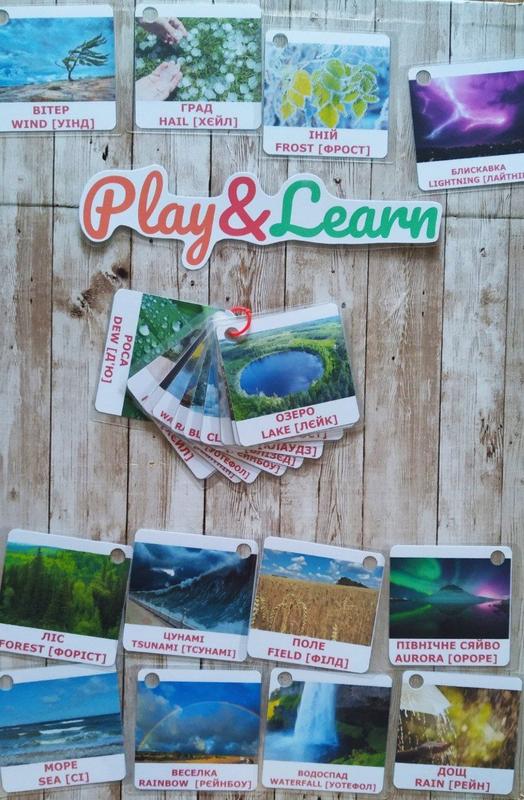 Двосторонні картки на кільці. Картки мають захисні поля ламінації. 24 елементи/12 карток. Кожна картка містить зображення, підпис українською та англійською мовами, транскрипцію українською мовою. Кільце за потреби знімається.