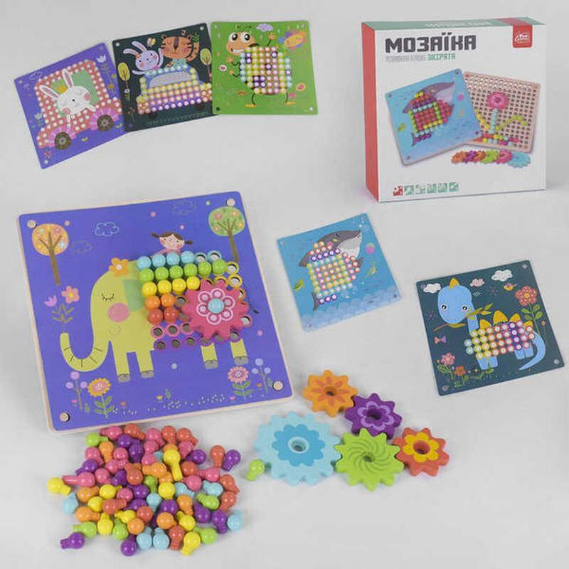 Мозаїка "Звірята" - це повноцінний ігровий центр для вашого малюка. З ним дитина у формі веселої гри буде розвивати логіку, просторове мислення, дрібну моторику рук, сприйняття кольорів і проявляти в повній мірі фантазію. Дерев'яна дошка по всьому периметру всіяна спеціальними отворами для різнокольорових кнопочок. З них дитина буде збирати різні форми, слова і цифри