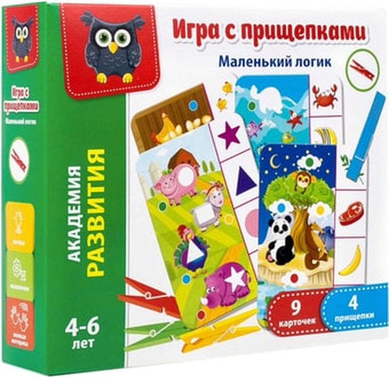 Игра состоит из цветных карточек и прищепок. На карточках находятся задания и варианты ответов. Ребенок должен выполнить их и обозначить правильные ответы прищепками. На другой стороне карточек изображены предметы или животные. Укажите, какой из рисунков лишний, прикрепив прищепку. Игра тренирует логическое мышление, внимание, восприятие, память и мелкую моторику.
