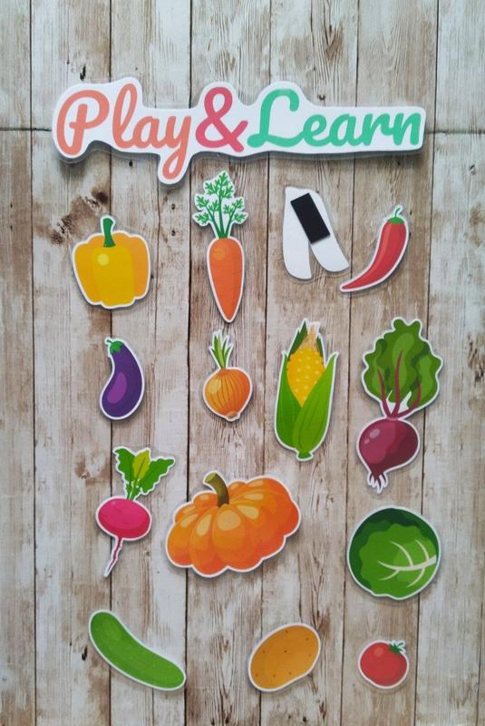 Овочі. 14 магнітів. Довжина: найменший - 4,5 см; найбільший - 11,5 см. Магніти водостійкі (за рахунок ламінації). Матеріал: Ламінований картон з додатковим магнітом. Магніти тримаються чудово, але малюки до 3 років мають гратись ними лише під наглядом дорослих!