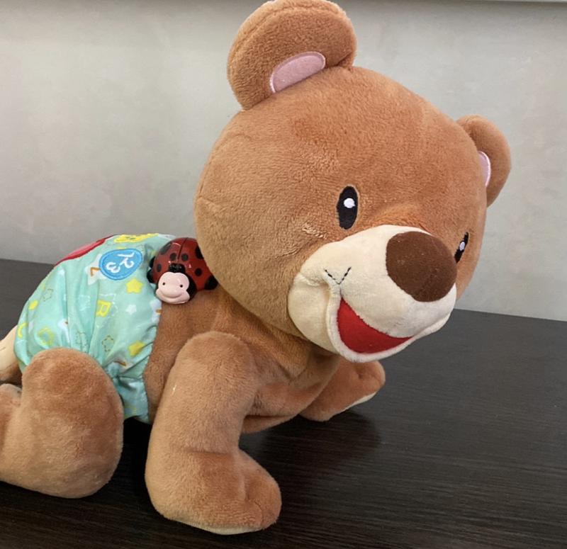 Интерактивная игрушка Vtech Ползающий мишка на русском позволит ребенку воспроизвести интересные игры и почувствовать приятные эмоции от замечательного досуга. Мишка умеет ползать и петь. На спинке есть 4 интерактивные кнопки, с помощью которых можно услышать 3 песни, 2 фразы и 10 мелодий. Световые эффекты мелькают в такт музыке. Для работы требуются 3 батарейки типа АА. Размер игрушки: 16 х 27 х 26 см. Игра с мишкой развивает воображение, внимание, творческие способности, фантазию и мелкую моторику. Состояние идеальное , все рабочее ! Дефектов нет