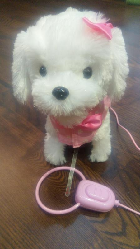 Надзвичайно гарненьке, біленьке цуценя. В рожевому платтячку, з поводком. Ходить, гавкає, найкращий друг для малечі
