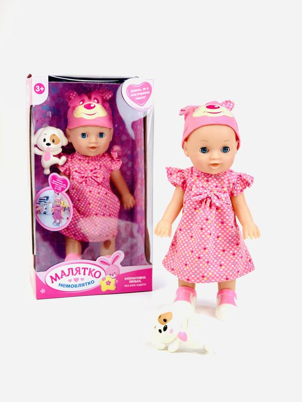Кукла интерактивная ТМ Малятко Интерактивная Кукла ТМ Малятко отличный подарок для девочек. Симпатичная кукла одета в розовое платье в сердечках и с бантиком и в розовую шапочку, на ножках ботиночки. В набор входит: кукла, погремушка. Эта замечательная кукла может: - смеяться, - говорить "мама" и "папа", - двигать ручками вверх и вниз. Эта милая кукла может стать любимой игрушкой для вашей девочки. Она поможет развить женские качества. С куклами интересно играть и развиваться. Их можно одевать, раздевать, купать, катать в коляске, расчесывать, кормить и даже коллекционировать. Это множество идей для творчества ваших деток!