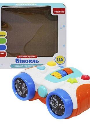 Музична іграшка виконана у вигляді бінокля, але подивитися в нього, як у справжній бінокль, не можна. Оснащений приємними крутилками-тріщалками та тактильними кільцями. Має приємне підсвічування і безліч навчальних функцій: - алфавіт; - цифри; - форми; - дитячі пісеньки. Озвучено українською. Працює від 2-х батарейок АА (немає в комплекті).