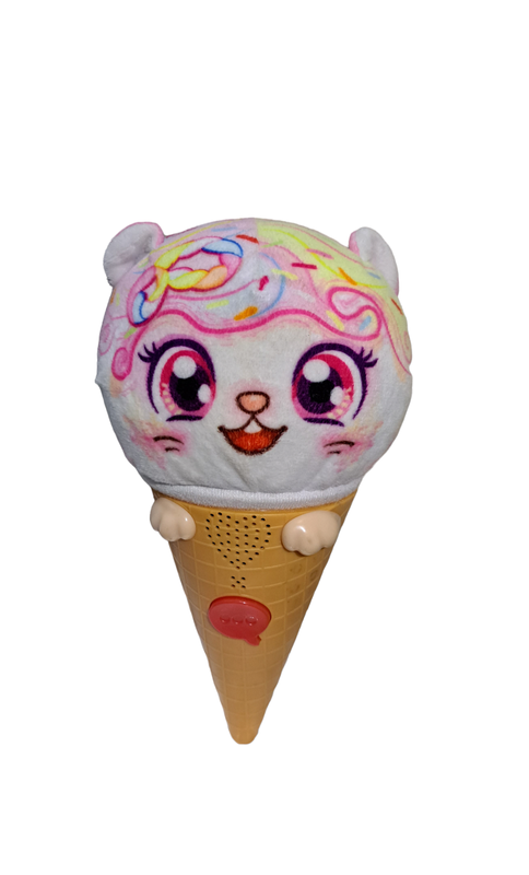 Игрушка повторушка Мороженое. Повторяет чувства в смешной манере. Чтобы начать запись, нажмите красную кнопку; ограничение продолжительности голосовых сообщений до 4 сек; при повторном нажатии фраза воспроизводится голосом мультяшным (динамик находится на вафельном рожке). Высота игрушки составляет 23 см. Питание осуществляют 3 батарейки типа ААА (в комплекте). Материал: текстиль, пластик.