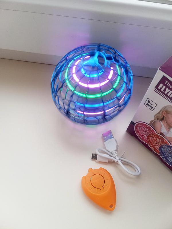 Летающий шар светящийся спинер FlyNova pro Gyrosphere Игрушка мяч бумеранг для ребенка Характеристики: - Зарядка через USB шнур; - Время зарядки: около 20 минут; - Продолжительность работы: до 10 минут; - Диаметр шара: 95 мм; - Вес шара: 27 г; - Вес упаковки: 100 г. Функции: Запускается и выключается шар нажатием на кнопку. Наклонив летающий шар назад и слегка вверх, бросьте его под углом 40-50 градусов, и он волшебным образом вернется в руку, как бумеранг. Наклонив летающий шар вперёд, подтолкните его и он полетит прямо. Держа шар ровно, подбросьте его вверх, шар взлетит и плавно опустится. Также шар запускается и останавливается брелоком. Описание: Игрушка развивает быстроту реакции, ловкость и внимание, а также координацию движений вашего ребенка. Два винта -- шестилопастный и трехлопастный, вращающийся в противоположном направлении относительно основного. По внутренней части натянута лента с яркими RGB светодиодами. Во время работы шар переливается разными цветами и выглядит очень красиво. Заряда аккумулятора хватает примерно до 10 минут работы. Заряжается шар 20 мин. Материал сферической оболочки гибкий и упругий, благодаря чему шару не страшны падения. В комплекте: - летающий шар; - брелок; - USB-кабель; - руководство пользователя; - фирменная упаковка.