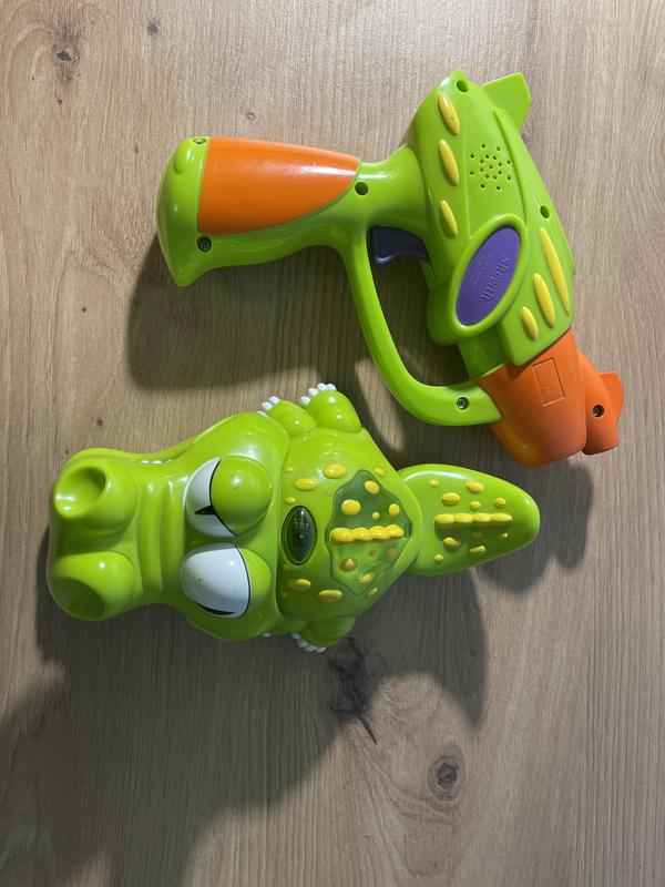 для детей в возрасте от 3 лет; пистолет с инфракрасным излучателем; Цель в виде крокодила; на спине крокодила расположен светоприемник; во время игры светоприемник загорается, в него нужно попасть в течение трех секунд; изготовлено из яркой высококачественной пластмассы; развивает точность и координацию. Рекомендуемое расстояние для стрельбы 60-270 см. Для мишени: батареи 3хАА-1,5V. Для пістолета: батарейки 2хАА-1,5V. Размер пистолета: 16х19х5 см. Размер мишени: 18х11х7. Размер упаковки: 39,4 х23, 5 х 9 см. Производитель: Silverlit.