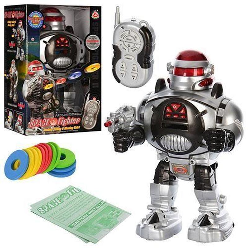 Уценка. (плохо реагирует на сигнал пульта) Робот на радиоуправлении. Ходит, танцует, поворачивается, поднимает оружие, стреляет дисками. Имеет световые и звуковые эффекты. На пульте. Инфракрасные лучи._ Бренд: FENG YUAN Упаковка: Коробка Цвет: Серебристый Тип эл-тов питания: Батарейки (АА) Эл-ты питания в комплекте: Нет Вес в упаковке: 1020 г Габариты в упаковке: 21 x 14 x 32 см Габариты без упаковки: 21 x 14 x 32 см Cтрана производитель: Китай Материал: Пластик Комплектация: Робот, пульт, диски