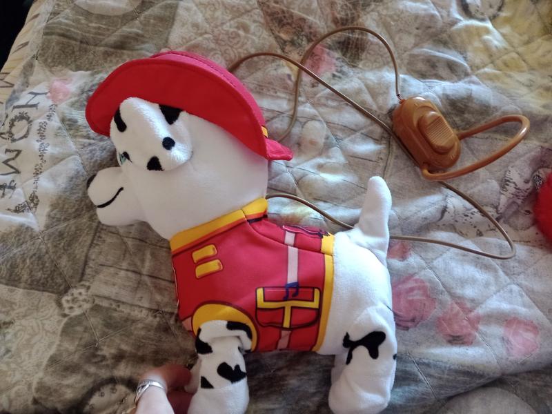 на поводке есть кнопки управления: лает и походная и поет песня. по ровному ходу нормально, а как по одеяло или немного не ровной поверхности может периодически падать на бок, но он так и новый делал.
