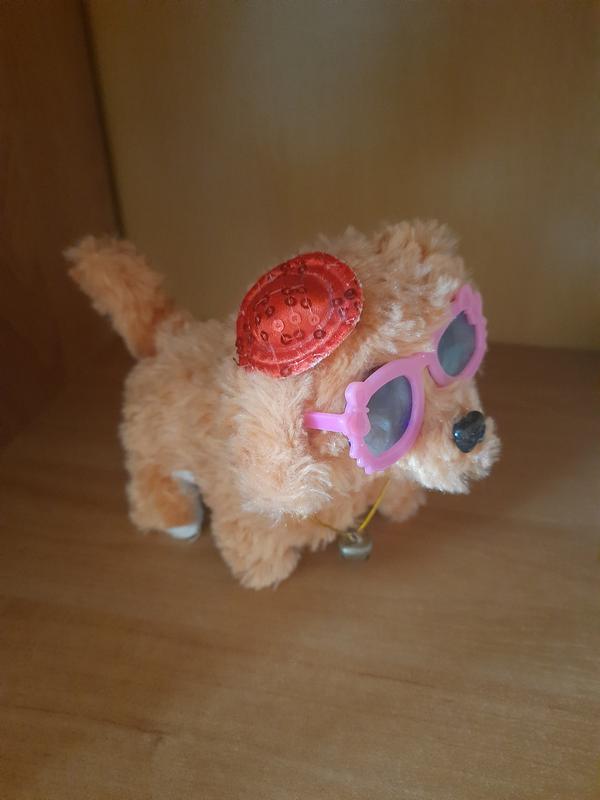 Собачка в отличном состоянии, подарили, но ребенку не зашла, практически не играли. Ходит, гавкает. Работает от 2х батареек типа АА, в комплект не входят.