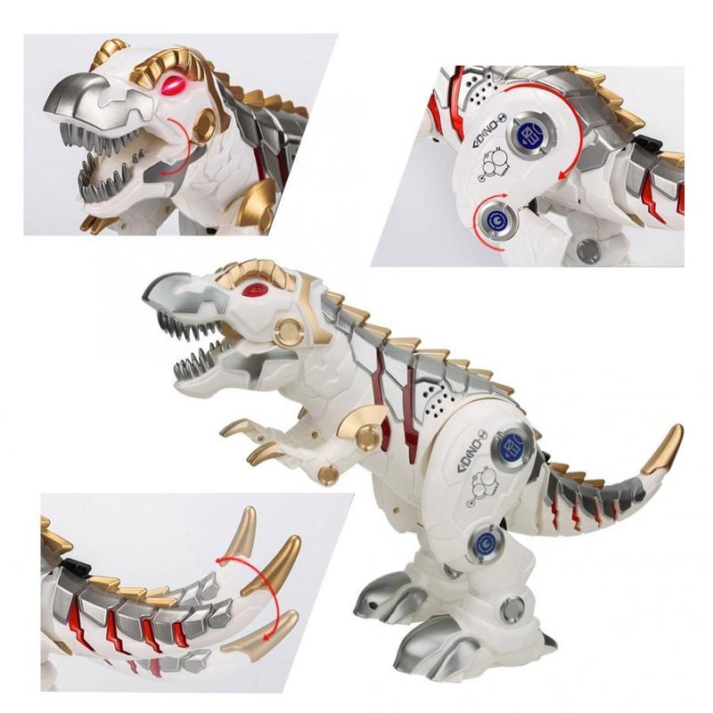 Динозавр на радиоуправлении выполнен в космическом стиле. Умеет ходить и скользить по направлению вперёд/назад, поворачивать вправо/влево в режиме ходьбы, танцевать под музыку и издавать реалистичные звуки рев. Эти действия задаются нажатием соответствующих кнопок на пульте управления. Во время игры динозавр светится красным цветом в области глаз, туловища и хвоста, машет хвостом в обе стороны, открывает и закрывает пасть. В игрушке предусмотрен демонстрационный режим. Динозавра можно запрограммировать на определённую последовательность действий. Игрушка работает от 3 батареек типа АА (в комплект не входят). Пульт управления работает от 2 батареек типа АА (в комплект не входят). Размер динозавра 42 * 13 * 24 см. Размер коробки 33 * 17 * 30 см.