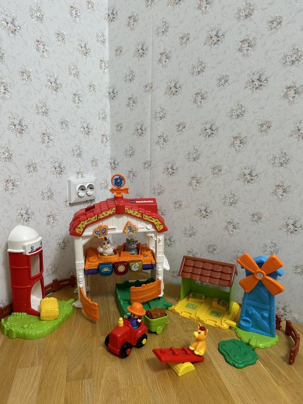 Набір Ферма, відомої фірми vtech, стан ідеал, тільки десь загубилася коровка (враховано в ціну), є коробка, без потертостей, тріщин, дитина майже не гралася, не було цікаво. Грає пісеньки, видає звуки тварин, англійська мова. У наборі йде трактор з причепом, гойдалка, фігурки тваринок та будівлі які можуть бути як з’єднані так і окремо. Дуже цікава інтерактивна іграшка для діток маленьких та старших