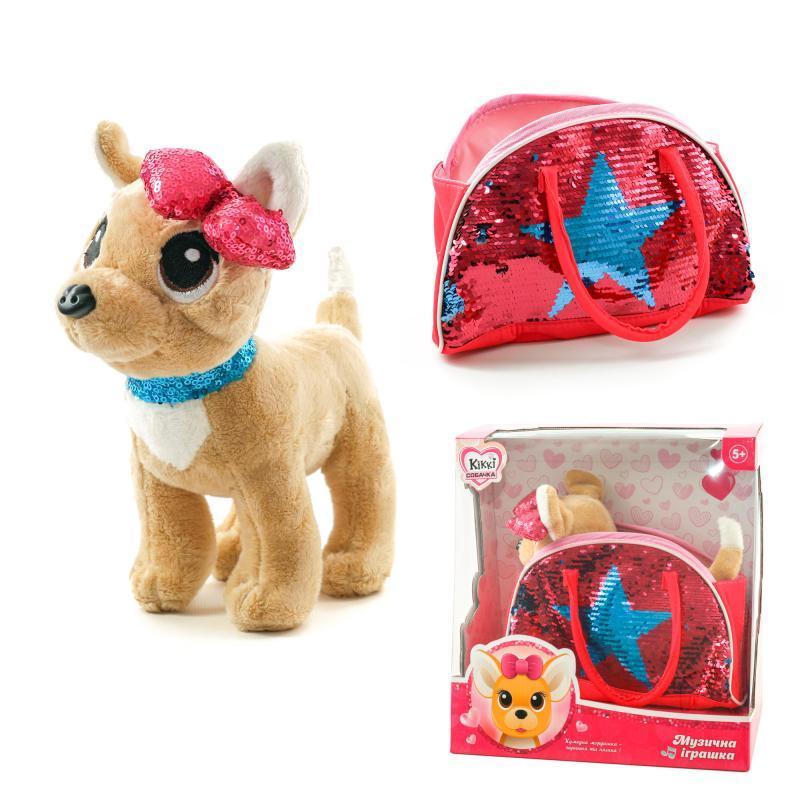 Інтерактивна іграшка "Собачка Кікі". М'яка тваринка, 20 см. Співає пісеньку на українській мові. Стильна сумочка в комплекті. Живлення - батарейка типу таблетка. Матеріал - пластик, текстиль. Упаковка - коробка. Розмір - 29,5х16,5х31 см.