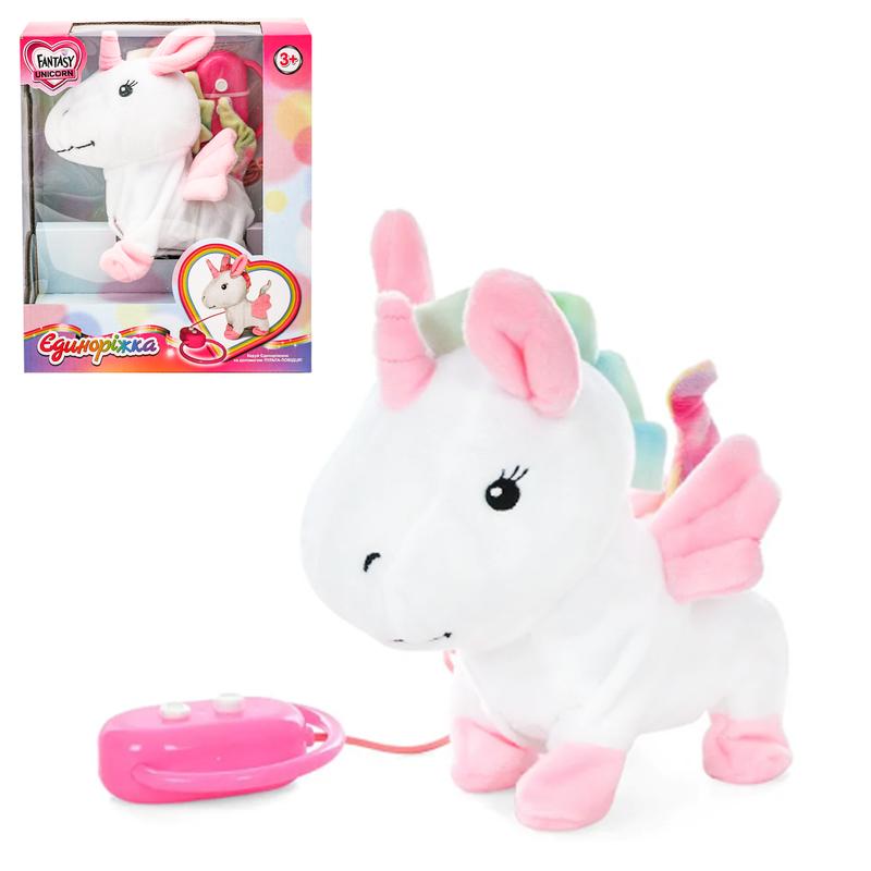 Інтерактивна іграшка "Єдиноріжка", з дистанційним керуванням. Зі звуковим та музичним супроводом. Висота іграшки - 20 см. Живлення - батарейки АА. Вік - від 5 років. Упаковка - коробка. Розмір - 24,5х14х21 см.