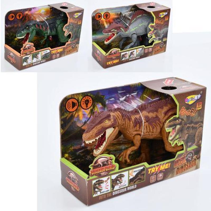 Інтерактивна іграшка "Динозавр", 3 види. Є звітлові та звукові ефекти. Живлення - батарейка типу таблетка. Матеріал - пластик. Упаковка - коробка. Розмір - 25х9х16 см.