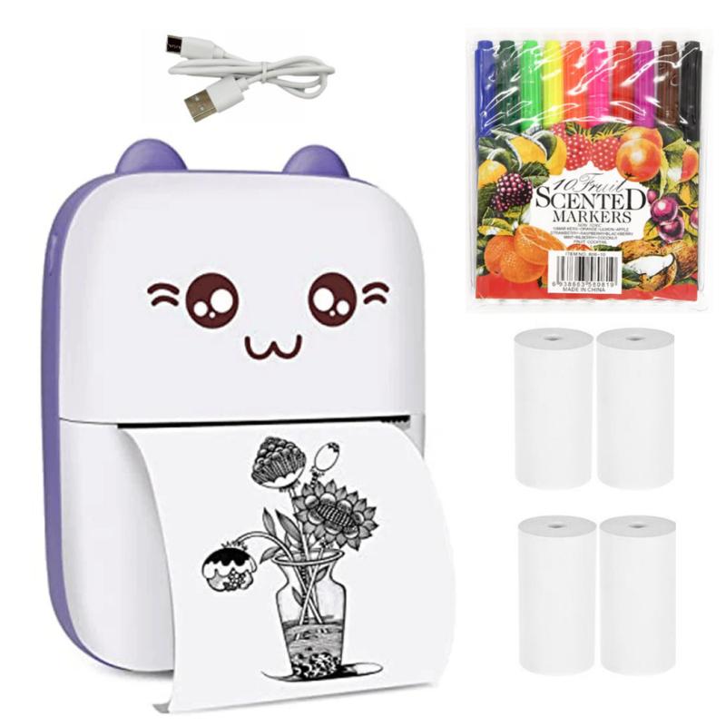 Детский мини принтер Mini Printer термопринтер детский Котик фиолетовый Невероятный маленький принтер Mini Printer поможет вашему ребенку почувствовать себя совсем взрослым, а также лучше запомнить буквы, цифры, новые слова, в игровой форме. На нём можно печатать раскраски, прописи, буквы, цифры, любимых персонажей, фотографии и многое другое, что сможет отвлечь вашего ребенка либо помочь в развивающих занятиях. Для более взрослых пользователей, это незаменимый помощник, который позволит записать, передать сообщение, снять снимок, скриншоты. На данном принтере можно печатать любую текстовую или графическую информацию прямо с вашего смартфона через bluetooth соединение. Благодаря своим компактным размерам, блютуз принтер всегда можно положить в карман куртки или небольшую сумку. Никаких проводов, вся работа с мобильным принтером происходит при помощи Bluetooth 4.0 и вашего смартфона. Не стоит беспокоиться, что в нужный момент в карманном принтере закончатся чернила, так как печать происходит без их помощи, а методом нагрева термобумаги. Особенности устройства: - Термопечать без использования краски - Прямая печать со смартфона через фирменное приложение FunPrint - Портативный и автономный мобильный принтер с встроенным аккумулятором 1000 мАч - Быстрое прямое соединение с вашим смартфоном по bluetooth каналу через фирменное приложение. - Просмотр содержимого перед печатью на экране вашего телефона. - Сохранение истории всей распечатанной информации. Технические характеристики: - Тип: карманный принтер, портативный bluetooth принтер - Тип печати: Термопечать. - Цвет печати: Черно-белая - Ширина печати: 53 мм - Расходные материалы: рулонная термобумага. - Размер бумаги: ширина 57мм. - Способ подключения: по Bluetooth. - Поддерживаемые смартфоны: Android, IOS. - Питание: встроенный аккумулятор 1000 мАч. - Размер: 113x 80 x 38мм. Комплектация: - Портативный термопринтер - 1шт. - Рулон термобумаги - 4 шт (1 в принтере + 3 дополнительно). - USB кабель для зарядки - 1 шт. - Инструкция. - фломастеры.