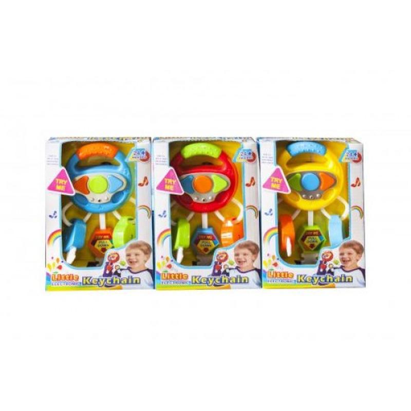 Музыкальный брелок. Состоит из основной части с ручкой, на которой 3 функциональныйе кнопки (музыка, звуковой сигнал, сигнализация). На брелке 3 ключика. Потяни средний ключик, и включится зажигание, звуки работы автомобиля.
