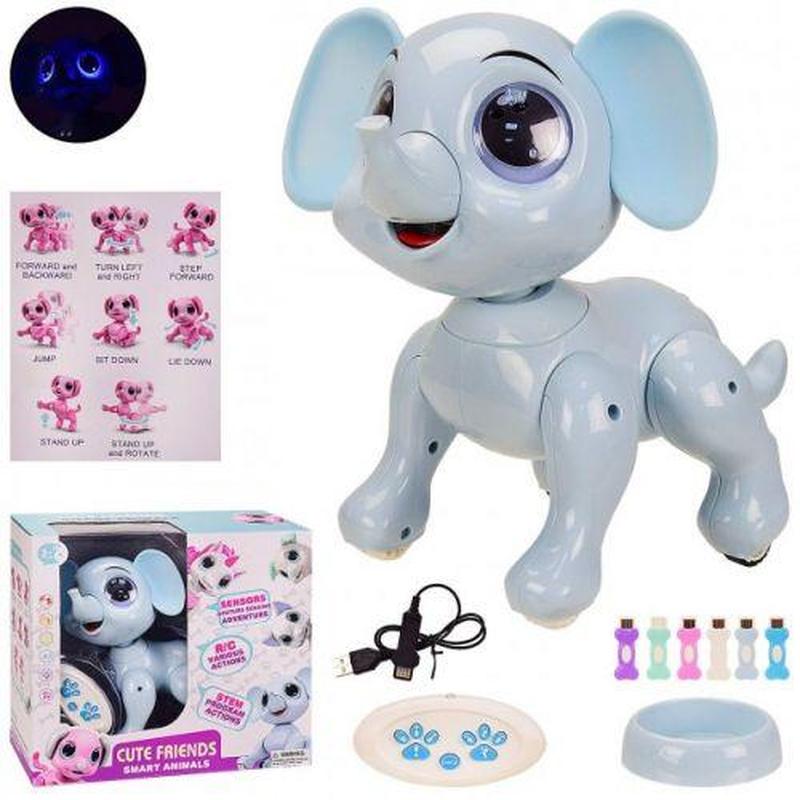 Розумна іграшка-робот "Слоненя" на радіокеруванні. Безліч команд на пульті управління: слоник може ходити в різних напрямках, бігати, стрибати, сідати і вставати, кружляти на місці, танцювати під веселу музику. Іграшка також реагує на рухи та жести, може змінювати напрямок залежно від рухів руки. Вміє оминати перешкоди. У наборі також є 5 "флешок" у вигляді кісточок, на які можна записати послідовності дій для іграшки. Працює від акумулятора, заряджається за допомогою USB-проводу (є в комплекті). Розмір іграшки: 22х21х10 см.