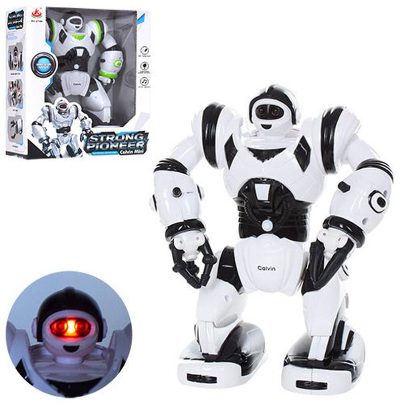 Робот музыкальный "Calvin Mini". Работает от батареек. Ходит, двигает руками. На руках есть кнопки, при нажатии на которые, робот"клацает" клешнями. При движении играет музыка, издает характерные звуки робота. Тип эл-тов питания: батарейки (АА) Кол-во эл-тов питания: 2 Эл-ты питания в комплекте: нет Вес в упаковке: 500 г Габариты в упаковке: 20 x 11 x 25 см