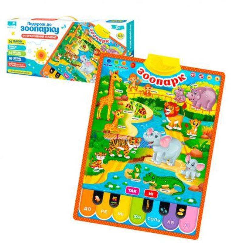 Плакат інтерактивний, який навчає "Зоопарк". Сенсорні кнопки, вологостійка поверхня, можливість розмістити як на столі, так і стіні. Плакат розповідає про 16 тварин мам та їхніх дітей, 16 віршів та загадок, 10 пісень та мелодій, 2 ігри "Так" або "Ні" та "Знайди, де чия мама". Також є кнопки з нотами (7 нот). 3 режими: вивчення, гра та іспит. Українською мовою. Розмір плаката 45х60 см. Бренд: Країна іграшок Мова: Український Паковання: Коробка Колір: Різнобарв'я Тип ел-тів живлення: Батарейки (АА) Кількість ел-тів живлення: 3 Ел-ти живлення в комплекті: Ні Вага з упаковкою: 370 г Габарити в упаковці: 21.5 x 46.5 x 3 см Країна виробник: Китай Матеріал: Комбінований Комплектація: Інтерактивний плакат