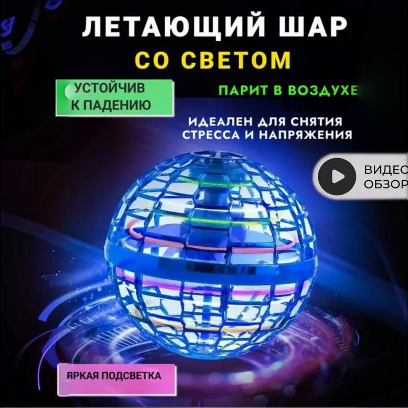 Летающий шар -- это захватывающая и инновационная игрушка, которая подарит массу ярких впечатлений и принесет удовольствие как детям, так и взрослым. **Основные особенности и преимущества:** - Игрушка способствует развитию реакции, ловкости, внимательности и координации движений. - Оснащён двумя винтами: шестилопастным и трёхлопастным, вращающимися в противоположных направлениях. - Внутри шара расположены RGB-светодиоды, которые создают эффект переливающихся цветов, придавая устройству красивый и привлекательный вид. - Заряд аккумулятора позволяет использовать шар до 10 минут, а зарядка занимает всего 25-30 минут. - Материал оболочки гибкий и упругий, благодаря чему шар устойчив к падениям. **Функции:** - Запуск осуществляется простым встряхиванием шара. - Если наклонить шар назад и слегка вверх, а затем отпустить, он вернётся в руку, как бумеранг. - При наклоне вперёд шар полетит прямо. - Если держать шар ровно и подбросить вверх, он взлетит и мягко опустится. - Можно положить шар на ладонь, и он будет левитировать. - Для остановки достаточно перевернуть шар и слегка встряхнуть его. **Характеристики:** - Зарядка через USB-кабель. - Время зарядки: около 25 минут. - Время работы: до 10 минут. - Диаметр шара: 95 мм. - Вес шара: 27 г. - Вес упаковки: 170 г. - Размер упаковки: 100х100х100 мм. **Комплектация:** - Летающий шар. - Оригинальная упаковка. - USB-кабель для зарядки. - Руководство пользователя.