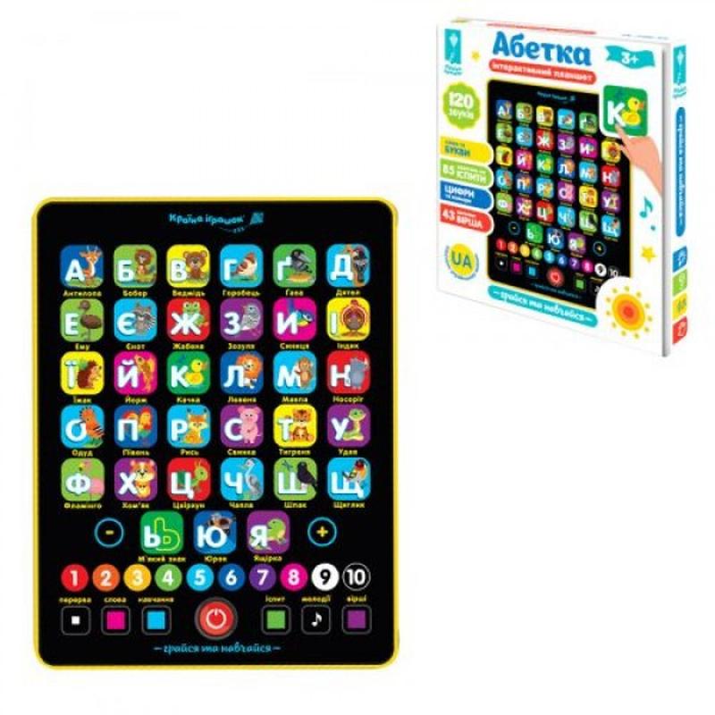 Планшет дарує можливість для навчання в невимушеній атмосфері гри. Функції: "Збігання". Увімкнення режиму звучання букв і слів. "Перерування". Весела рухлива гра, що дає змогу дитині відпочити від навчання. "Екзамен". Перевіримо знання. Уважно слухайте запитання та натисніть правильні відповіді. 85 запитань, цифри та кольори, 43 веселих вірші, мелодії та пісні. українською мовою._