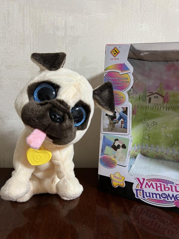 Игрушка умный щенок питомец. Музыкальный. Соответствует на команды, поет песенки, говорит слова на английском языке. Ну, очень милый. Состояние хорошее, дочь его очень любила. Работает от 4 батареек (в комплекте их нет)