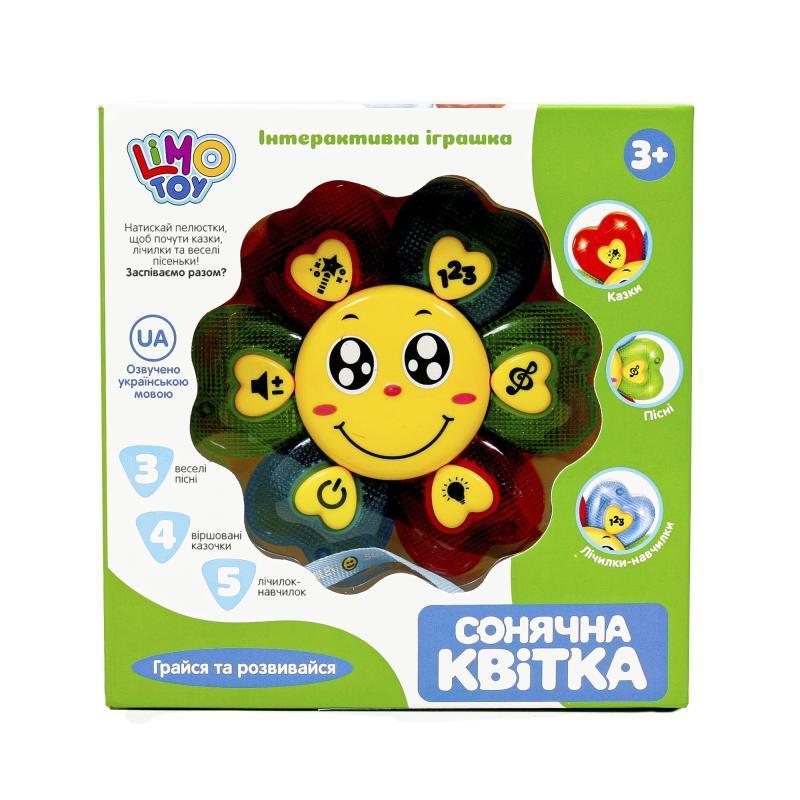 Інтерактивна іграшка "Сонячна квітка", 11,5 см. Озвучення українською мовою. Є звукові та світлові ефекти. В пам'яті скоромовки, казки та пісні. Живлення - батарейки. Упаковк - коробка. Розмір - 16,5х4,5х16,5 см.