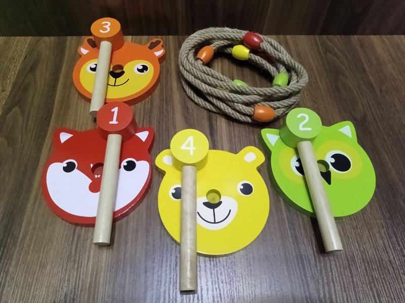 Интересная игра компании Playtive, для деток от 4 лет. Игра в бросание колец поддерживает координацию рук и глаз, моторику и ловкость. Качество деревянных изделий игры очень высокое, изделия приятные на ощупь. деткам будет интересно играть и начать изучать цифры. Набор состоит из 4 оснований с фигурками и 8 колец для метания. Производитель Германия. Игры новые, в коробке, можно на подарок.