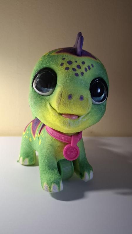 Интерактивная игрушка Hasbro Большой питомец Динозавр Дино на поводке FurReal Friends Walkalots Big Wags Dino. Динозаврик оснащен звуковыми эффектами и колесом, чтобы ездить по ровной поверхности. К ошейнику животного можно прикрепить регулируемый по высоте поводок и ходить с ним на прогулку. Зверек во время движения будет качать головой и двигать хвостиком. Изготовлен из качественного красочного пластика и плюша. Для питания требуются 3 батарейки типа А76. Рекомендуемый возраст: от 4 лет. Подержанное в отличном состоянии.