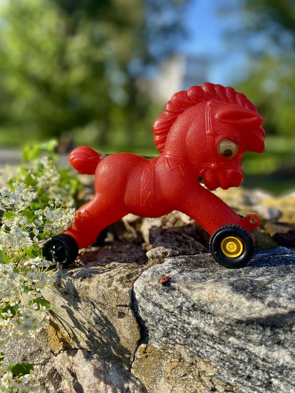 Миле лоша-каталочка 🎠 кінця 1970-х років! Іграшка для найменших і антистрес для батьків, бо гра з такою не тільки захоплює, а й розвиває навички малюка!🌸 Коника - Горбоконика можна катати на мотузці, гратися в піску, катати ляльок! Це знаменитий Дніпропетровський завод іграшок! Дутий легенький пластик, очки-брязкальця, міцні колеса. Розмір: 18 х 12 х 6 см. Стан відповідно фото.