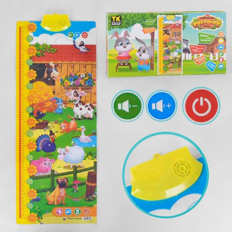 Интерактивный ростомер "Говорящая ферма" – развлечение и обучение для вашего ребенка! Этот яркий ростомер не только поможет следить за ростом вашего малыша, но и откроет перед ним волшебный мир домашних животных. С "Говорящей фермой" ребенок сможет проводить время весело и с пользой. Особенности ростомера: - Шкала роста для постоянного наблюдения за изменениями. - Интерактивные игры, способствующие развитию памяти и внимания. - Четыре веселых песенки для хорошего настроения. - Одиннадцать озвученных животных, которые познакомят ребёнка с разнообразным миром фермы. Громкость можно настроить, а специальное крепление позволяет разместить плакат на столе или повесить на стене. Плакат изготовлен из прочных полимерных материалов, которые обеспечивают его длительную службу. Влагозащитная поверхность и сенсорные кнопки делают его еще удобнее в использовании. Интерфейс игрушки – на русском языке. Работает от трёх батареек типа ААА (не входят в комплект).
