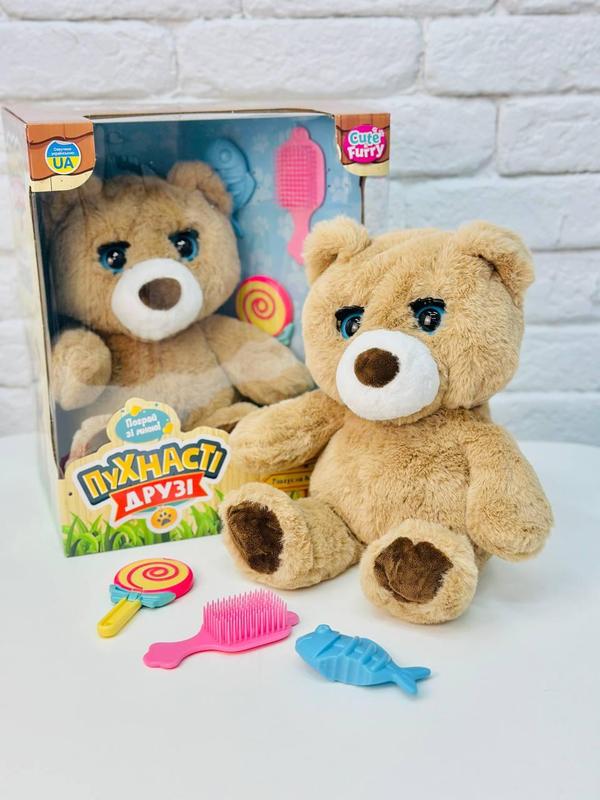 🧸 Интерактивная мягкая игрушка с украинским языком -- лучший плюшевый друг 💛💙 Это не просто мягкая игрушка, а настоящий друг, который поёт, моргает, реагирует на прикосновения и даже засыпает вместе с ребёнком 🌙. Идеально подходит для обнимашек, игр и уютного сна 🎶 * * * ✅ Особенности: - 🖐️ 7 интерактивных функций -- реагирует на прикосновения, моргает глазами, поёт, засыпает и др.; - 🇺🇦 Украинский язык -- поёт песенки и говорит; - ✨ Мягкий, безопасный плюш -- гипоаллергенный и приятный на ощупь; - 🎁 3 аксессуара в комплекте -- для увлекательной игры; - 🔋 Работает от 3 батареек АА (в комплект не входят). * * * 📐 Характеристики: - 📏 Размер: 31×19×12 см - 🎤 Язык: украинский - 🔋 Питание: 3×АА батарейки - 🧵 Материал: мягкий плюш, гипоаллергенный наполнитель * * * 📦 Комплектация: - 1 × интерактивное животное - 3 × аксессуара - 1 × коробка 🌟 Идеальный подарок, который оживает от прикосновений и любви!
