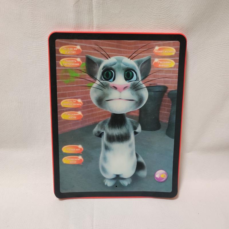 Интерактивный планшет с популярным персонажем игры "Кот Том" Язык русский - умеет повторять сказанное ребенком - выполняет команды, которые написаны на планшете (к примеру, если сказать ему "расскажи анекдот" - он расскажет) - реагирует звуками на прикосновения - когда разговаривает, глазки светятся синим Состояние отличное, все работает В одном углу немного отклеился материал - показала на последней фотографии