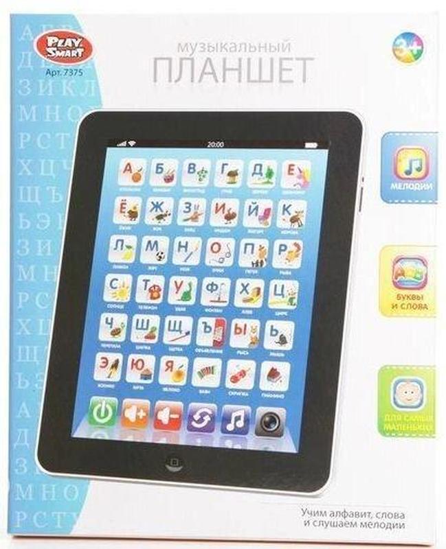 Детский обучающий планшет Play Smart 7375 Три цвета синий ,черный,белый Play Smart 7375- это интерактивный развивающий компьютер, который позволит Вашему малышу выучить свои первые слова и буквы, придумать мелодию или выучить песенку. Учебный планшет, тип сенсора (имитация сенсорного экрана) Все задания и игры на планшете будут интересны детям дошкольного возраста. Удобное меню компьютера создано для того, чтобы ребенок без помощи взрослых мог включить компьютер и выбрать программу. Отсутствие лишней информации, дополнительных окон и отвлекающих элементов позволяют малышу сосредоточиться на процессе обучения, детально изучать все имеющиеся кнопки и программы. Детский развивающий планшет Play Smart с дисплеем 9,5 дюймов. Предназначен для детей младшего дошкольного возраста. На русском языке. Данная модель использует 3 батарейки типа АА(идут в комплекте) . Игрушка для развития внимания, слуха, знаний. Игрушка содержит 42 кнопки, буквы, животные, кнопки со словами, кнопки произношение, кнопки "найди букву" "найди цифру", песенки, алфавит. Функции Песенка русский алфавит Произношение букв найди букву,найди предмет При на нажатии на кнопку камера-планшет говорит: «Улыбайтесь Вас снимает скрытая камера» Название предметов, животных, еды При включении говорит -«привет, малыш давай вместе….» Режимы: 1. Учить слова (планшет произносит каждое слово) 2. Учить буквы (планшет произносит каждую букву) 3. Поиск букв (планшет спрашивает «найди букву А,» находишь эту букву, нажимаешь, если правильно, то планшет говорит" молодец" если ребенок ошибается, то планшет говорит" подумай еще " и т.д.) 4. Поиск слов — Так же спрашивает, ребенок ищет и отвечает. 5. Буквы, читает полностью алфавит Выключаешь, планшет говорит «до новой встречи». Размеры упаковки(cм) : 23 × 29 × 2 Размеры планшета 18,5*24*1,8см Вес: 380 гр. Работает от 3 батареек AAA ( не входят в комплект). Их можно докупить отдельно за 5грн