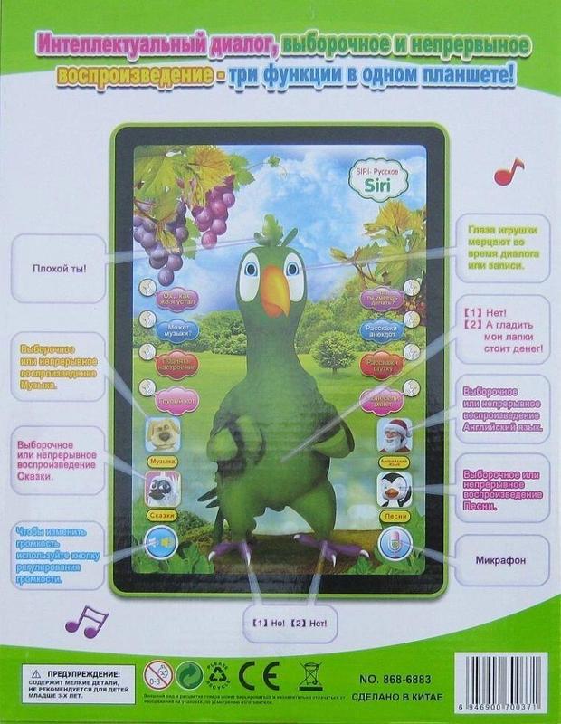Детский планшет говорящий 3D «Озорной попугай» Интерактивная говорящая игрушка «Озорной попугай» 6883– веселый собеседник для Вашего ребенка, он обладает хорошим чувством юмора, четкой речью и хорошей звуковой подачей, что хорошо влияет на развитие у ребенка правильного произношения звуков и улучшает способности общения с окружающим миром. Реагирует не только на голос, но и на звуки (хлопки, щелчки). Юморной попугай повторит все слова сказанные Вами смешной интонацией. Выполнен он по подобию персонажа из игр для iPhone и Android. Популярные песни шутки, история входят в содержания маленького затейника. Характеристика: - Красивая картинка высококачественная с эффектом 3 D. - Чистый звук – цифровая обработка сигналов Crista Voice. - Распознает звуки в пределах 8-10 метров. - Используется система LED – для мерцания глаз ( во время диалога или записи ). - Сенсорное управление – легкое нажатие кончиками пальцев приводит в действию кнопок, а также прикасаясь к частям тела попугая он издает звуки. - Чип нового поколения, который и отвечает за быстроту обработки информации. - Материал, из которого исполнена игрушка, совершенно безопасен и обладает хорошей прочностью. - Воспринимает 8 фраз и у него есть на них около 39 оригинальных и веселых, остроумных ответов. - Ножки, щечки, глазки, животик, хвостик, лобик – реагируют на прикосновение звуковым или световым эффектом. Для детей старше 3-х лет. Размер коробки: 245мм*315мм50мм Размер: 25см*18см*3см Питание: 3шт х АА (в комплектацию не входят) Цвет: салатовый,фиолетовый, белый Комплектация: - Планшет - Ножка-подставка - Инструкция - Коробка картонная с ручкой