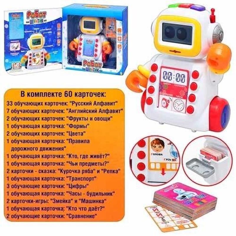 Обучающий робот Шунтик Обучающий робот Шунтик имеет в комплекте 60 карточек: 33 "Русский Алфавит" 7 "Английский Алфавит" 2 "Фрукты и овощи" 1 "Формы" 2 "Цвета" 1 "Правила дорожного движения" 1 "Кто где живет?" 1 "Чьи предметы? 2 карточки-сказки "Курочка ряба" и "Репка" 1 "Транспорт" 3 "Цифры" 1 "Часы-будильник" 2 карточки-игры "Змейка" и "Машинка" 1 "Кто что дает?" 2 "Сравнение" Видеообзор товара по ссылке *******************************************