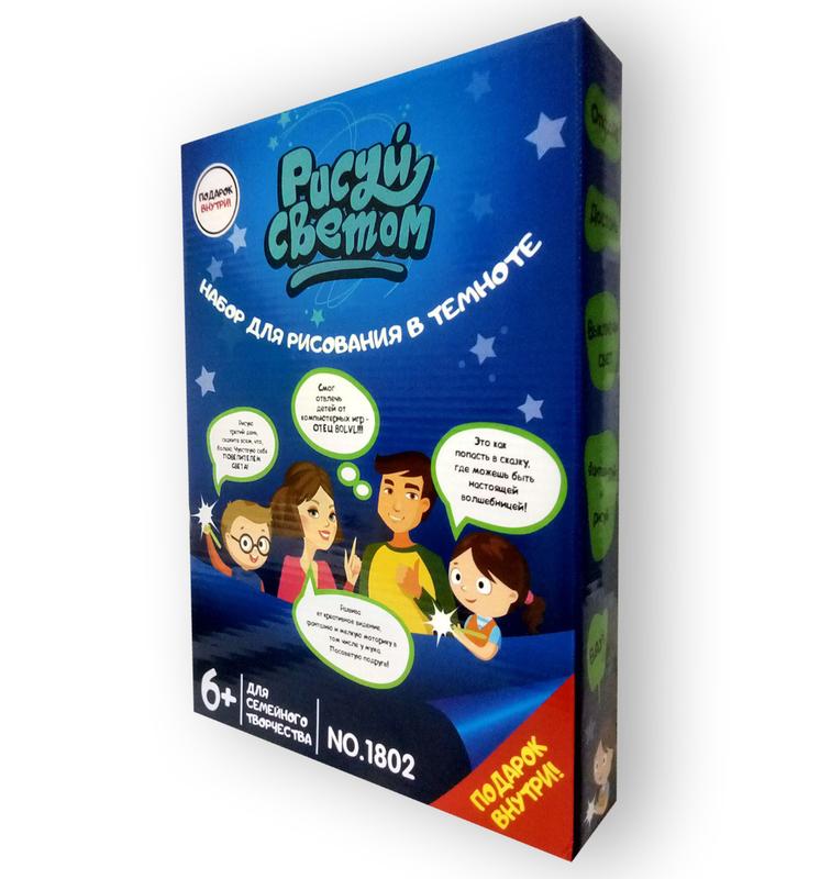 Планшет – товщина 5 мм, А3 (30х43 см). Светодиодный фонарик (световой маркер). Руководство по применению набора. Трафарет, который поможет рисовать простые фигуры: зайца, вертолет, воздушный шар и другие. Способствует развитию фантазии, памяти и творческих способностей. Арт-терапия. Снижение страха темноты. Возраст 6+. Упаковка: Картон Размер упаковки: 46х33х1,5 см