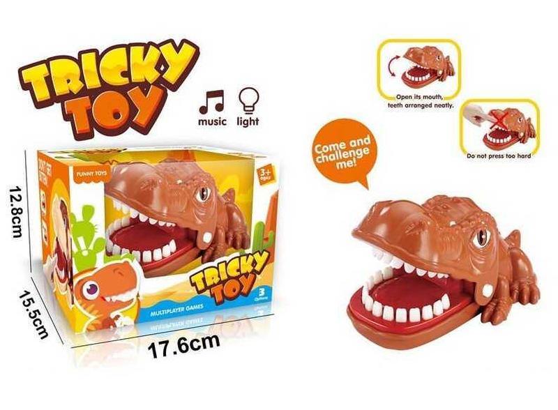 Повеселитесь с игрой “Зубастик”! Эта захватывающая настольная игра — настоящая находка для детей, которая обещает море радости и веселья! Яркий динозавр с цветным оформлением способен привлечь внимание малышей, а его широкие челюсти, полные белоснежных зубов, добавляют игре интриги. Будьте осторожны, ведь один из зубов может неожиданно закрыть пасть! Как играть? Оставайтесь внимательными и осторожно открывайте челюсти динозавра. Перед вами расположены ряды его белоснежных зубов. По очереди нажимайте на каждый из них и не попадайтесь в ловушку: один из зубов способен быстро закрыть челюсти! Особенности игры: - Настольная игра выполнена в форме динозавра; - Звуковое сопровождение для дополнительного азарта; - Яркое цветное оформление; - Работает от 2 батареек типа AAA (не входят в комплект); - Изготовлена из прочного и безопасного пластика.