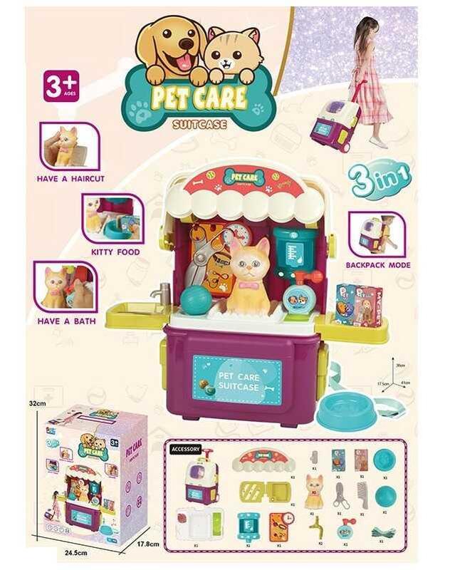 Погрузитесь в мир ухода за любимцами! Этот уникальный игровой набор с котятами станет отличным подарком для маленьких любителей животных. Он впечатляет своей оригинальной чемоданчиком, который не только удобен для транспортировки, но и превращается в настоящий груминг-салон! Ваш малыш станет настоящим грумером, ухаживая за своим пушистым другом. Особенности набора: - 17 игровых элементов для увлекательных игр; - Чемодан с раскладной конструкцией для удобства использования; - Дополнительные аксессуары: миска, расческа, щетка, мяч, "Еда"; - Размеры чемоданчика в разложенном виде: 41х17х38 см; - Изготовлено из прочного и безопасного пластика. Этот набор не только развлечет ребенка, но и станет отличным способом научить его основам ухода за животными!