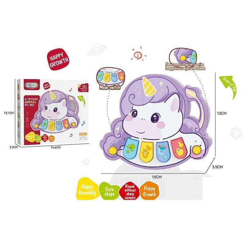 Музыкальное пианино для детей с забавным дизайном Детское пианино с артикулом 368-90 M и изображением милого единорога помогает развивать слух и моторику ребенка. Яркие цветные клавиши издают разные звуки, что заинтересует малыша и способствует его творческому развитию. - Размер: 15x13x3.5 см - Мультяшный дизайн в виде единорога - Клавиши с разными звуками - Кнопка переключения режимов - Регулировка громкости - Безопасный материал для детей