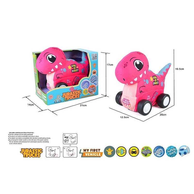 Яркая мягкая машинка для малышей “Динозавр” Эта мягкая машинка станет любимой игрушкой вашего ребёнка. Изготовлена из мягкого текстиля на пластиковом каркасе, что делает её безопасной и приятной на ощупь. Благодаря резиновым шинам машинка легко катится по любой поверхности. - Размер: 26х12.5х19.5 см - Воспроизводит звуки транспорта и веселые мелодии - Вибрация во время игры для большей реалистичности - Работает от 3 батареек типа AA (не входят в комплект) - Съемный чехол для удобной стирки - Музыкальный блок с платформой для конструктора (конструктор не входит) Игрушка способствует развитию моторики, воображения и музыкального слуха ребёнка, дарит весёлые эмоции во время игры.