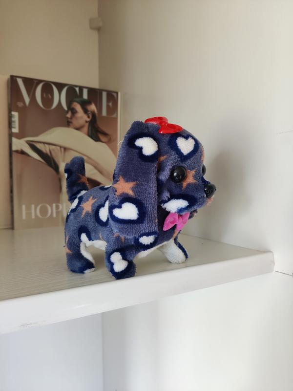 Интерактивная, маленькая игрушка собачка. Сверху выполнена из велюровой ткани, внизу пластик. Двигается и гавкает. Работает от батареек (батарейки в комплекте). В идеальном состоянии.