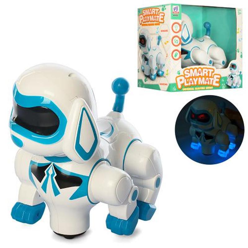 интерактивная игрушка робот собака 18см, со световыми и музыкальными эффектами, ходит, ездит, двигает головой, садится, во время движения издает звуки, двигает хвостом, коробка - 24-23-15см, 2 цвета - бело-голубой и бело-оранжевый, работает от батареек.
