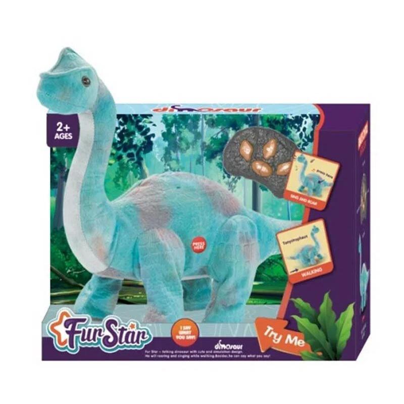 Интерактивный брахиозавр выполнен в точности, как настоящий динозавр, массивное тело с длинной шеей и маленькой головой покрыто мягким, приятным на ощупь текстильным материалом, окрашено в голубой цвет и имитирует огрубелую толстую кожу рептилии, пульт управления в виде камня с 4-мя коричневыми кнопками образует оставшийся след ящера. Управление: “Roar&Walk” - ходьба и рычание; “Sing&Walk” - воспроизведение 2х мелодий и ходьба; “Talk” - запись и повторение голоса; “Pause/Start” - останавливает/воспроизводит действия. Нажимая на кнопку “Talk” ребенок сможет записать различные фразы, после того, как динозаврик запишет голос, он начнет воспроизводить его при ходьбе, останавливаясь, чтобы записать следующую фразу. Пульт управления работает от 2х батареек типа “АА” - в комплект не входят. Звуковые эффекты динозавра работают от 3х батареек типа “ААА” - входят в комплект, размер коробки 34-15-24 см