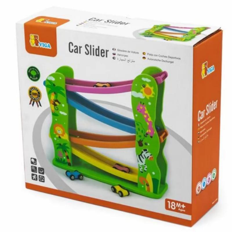 Красочный развивающий набор для мальчиков от 18 месяцев. Может использоваться как дома, так и в детских садах и центрах развития. Детский автотрек состоит из деревянной ярко-салатовой основы с летним принтом (солнце, пальмы, экзотические животные) и 4 изогнутых уровней разных цветов (розовый, желтый, оранжевый, синий). В наборе также 4 игрушечные машинки. Маленькие и маневренные, они легко скользят по треку сверху вниз.